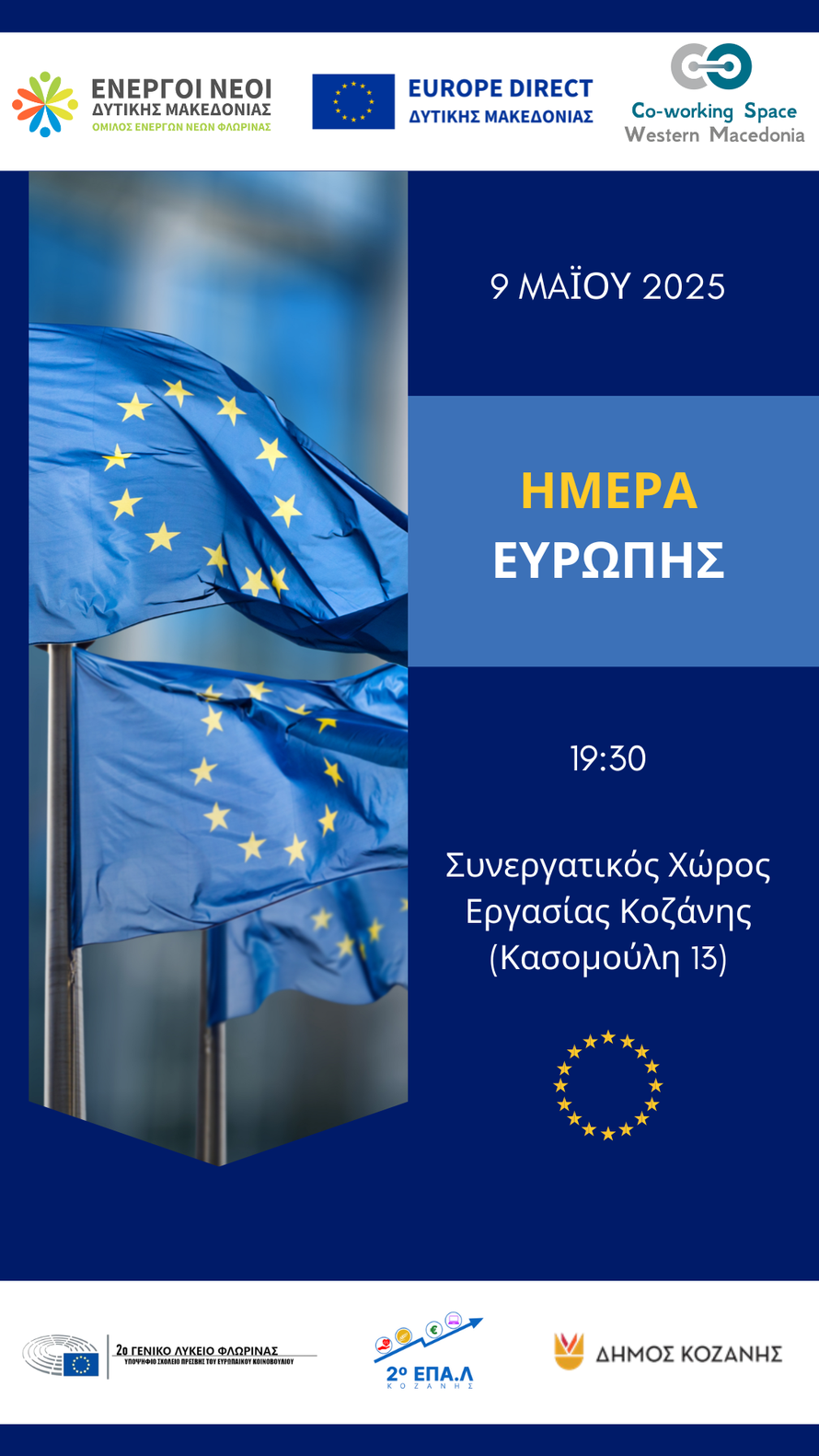 Δήμου Κοζάνης, σας προσκαλούν στην εκδήλωση που διοργανώνουν για τον εορτασμό της Ημέρας της Ευρώπης, την Παρασκευή 9 Μαΐου