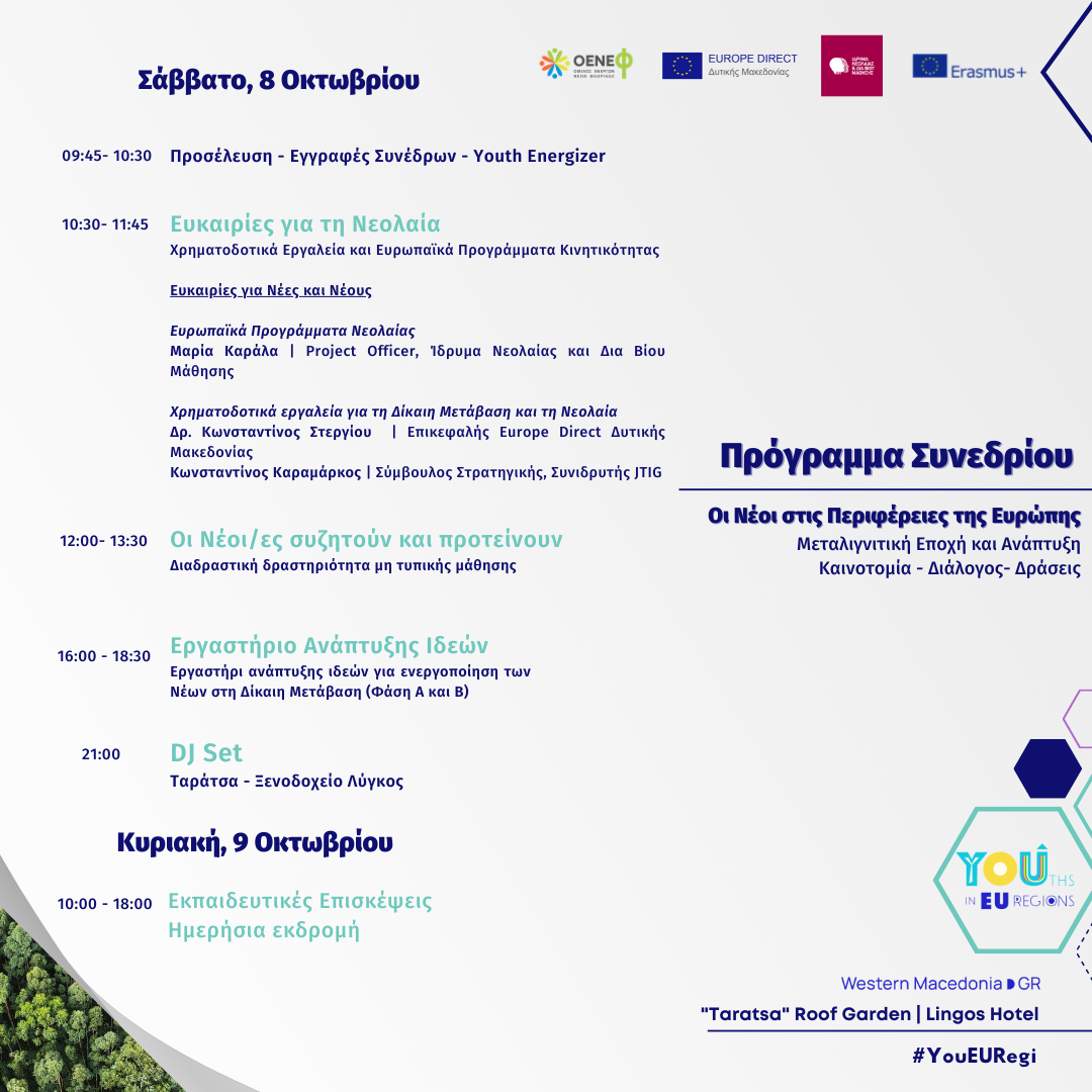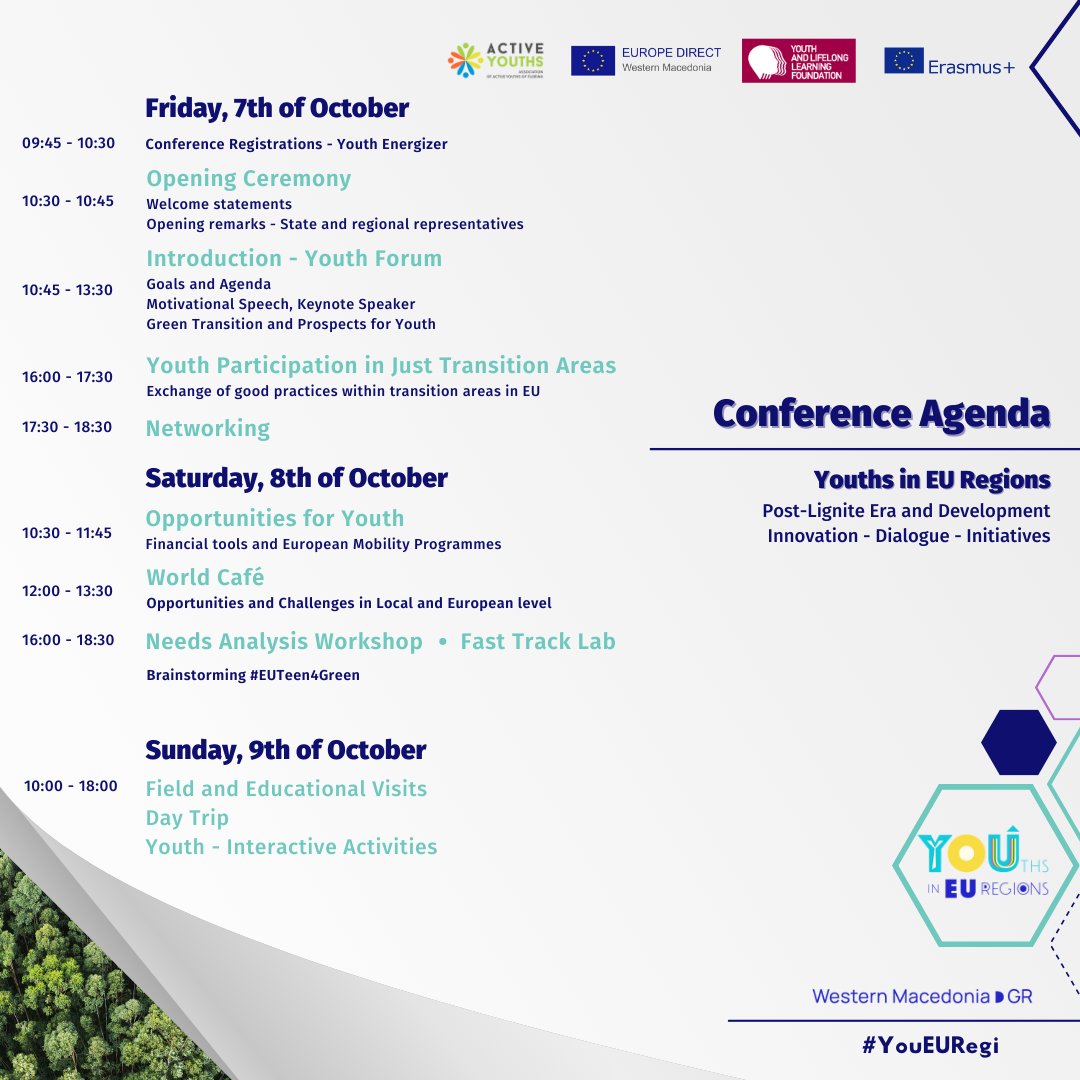 (Βασική Δράση 3 (KA3/ΒΔ3): Ενίσχυση σε θέματα μεταρρυθμίσεων πολιτικής) και το Ίδρυμα Νεολαίας και Δια Βίου Μάθησης (ΙΝΕΔΙΒΙΜ). Το συνέδριο με τίτλο «Οι Νέοι στις Περιφέρειες της Ευρώπης – Μεταλιγνιτική Εποχή και Ανάπτυξη – Διάλογος, Καινοτομία και Δράσεις» θα αποτυπώσει την εγγενή διάθεση για μία
